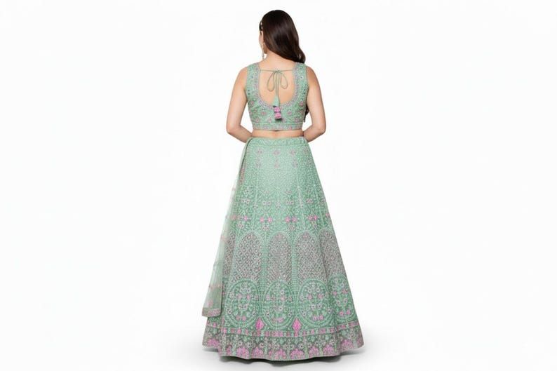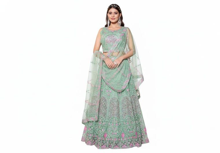 We offer a stunning Ladies Mint Green Embroidered Lehenga Choli Set perfect for weddings. This set includes a Lehenga Choli with Dupatta made from a luxurious Net & Satin Blend material. The main color is a refreshing Mint Green with intricate Heavy Sequin & Thread Embroidery work. The set contains a Full-Length Lehenga that is Semi-Stitched for a customizable fit. Care instructions recommend dry clean only. Ideal for Manufacturer, Exporter, Supplier businesses looking to provide exquisite ethnic wear options.