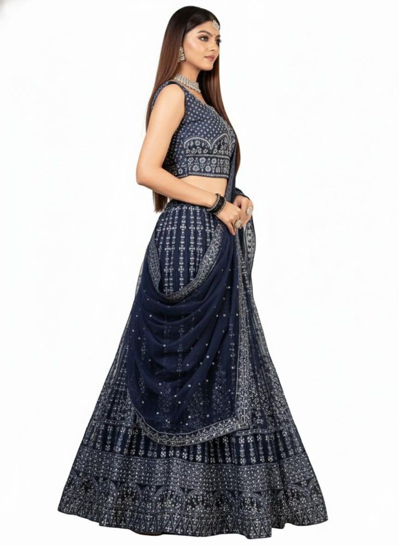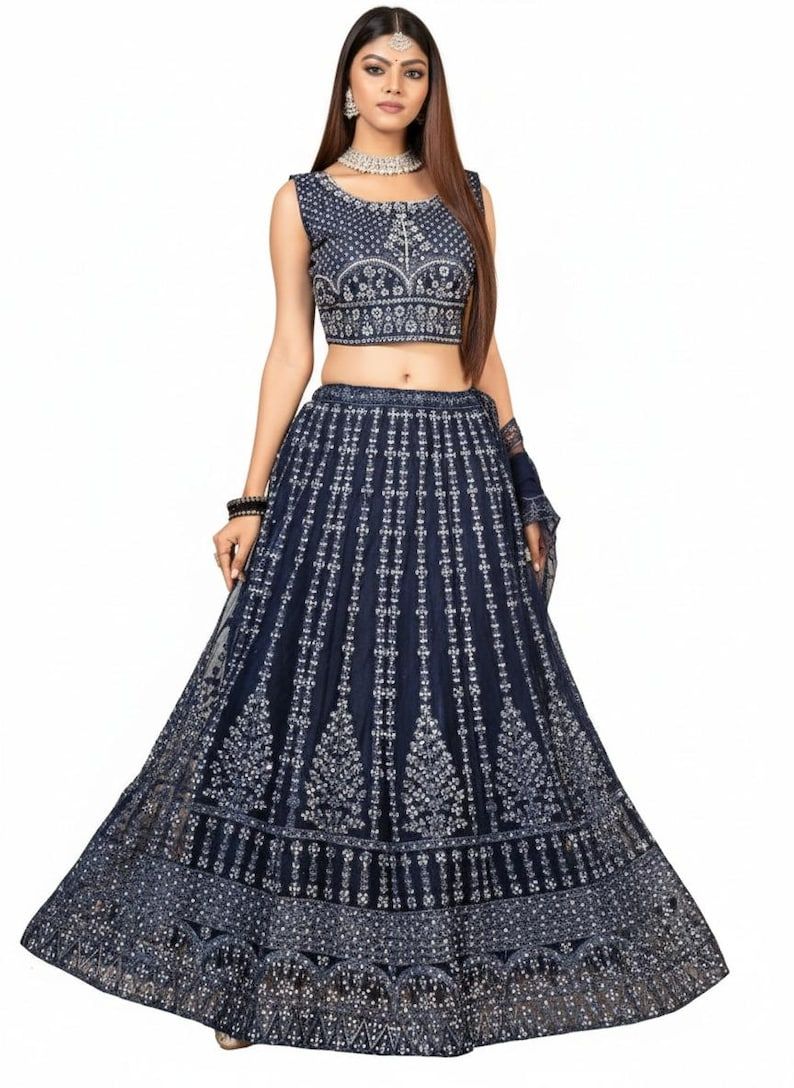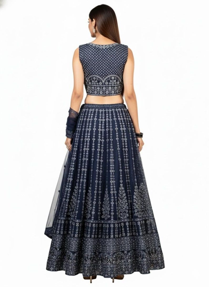 We offer a stunning Ladies Navy Blue Embroidered Lehenga Choli Set perfect for weddings. This set includes a Lehenga Choli with Dupatta made of Net with a soft Satin inner lining. The main color is Navy Blue with heavy sequin and thread embroidery work. The set contains a full-length Lehenga that is semi-stitched for easy customization. Care instructions recommend dry clean only. Ideal for manufacturers, exporters, and suppliers looking to provide exquisite ethnic wear options.