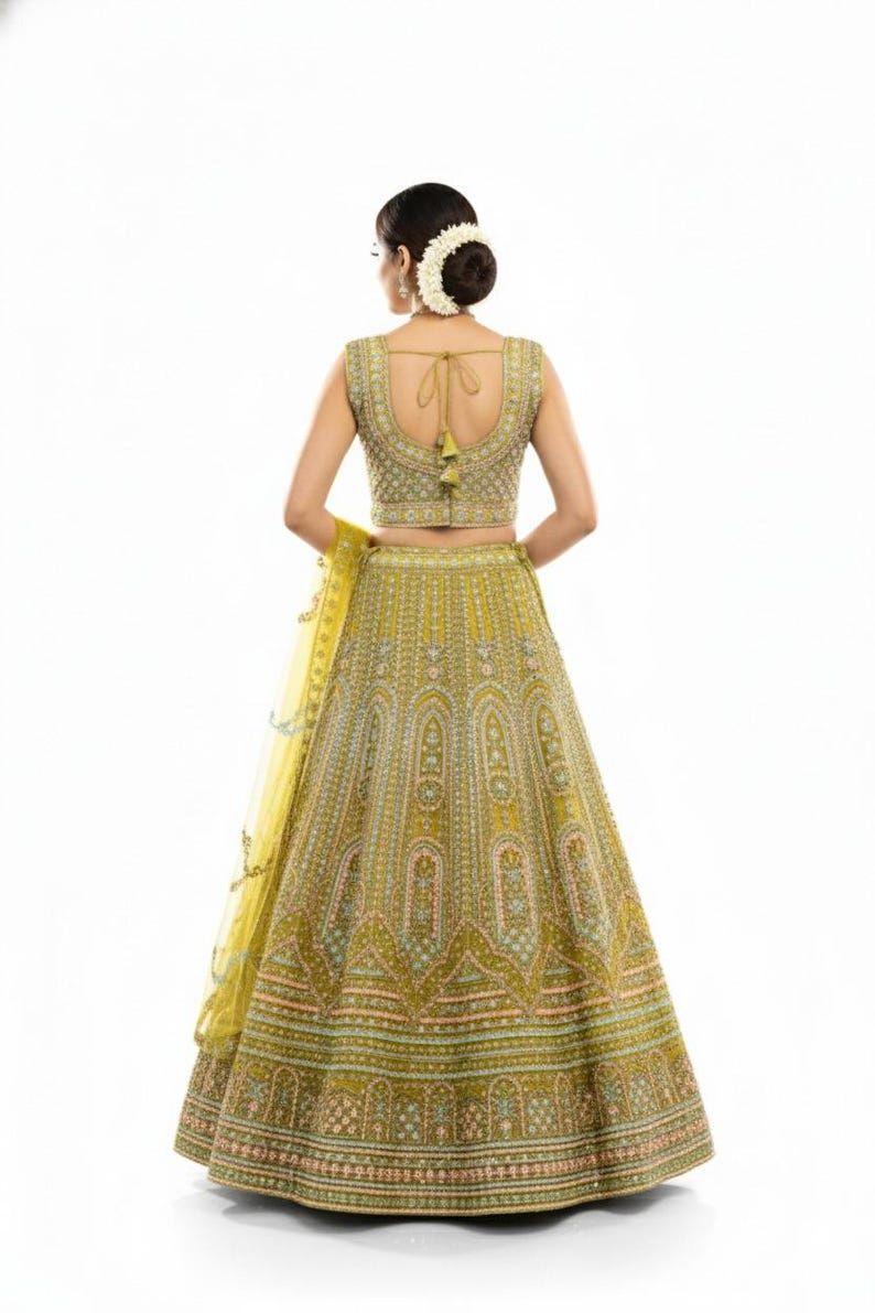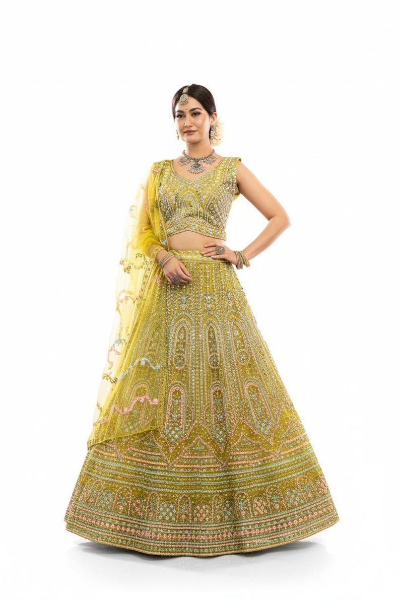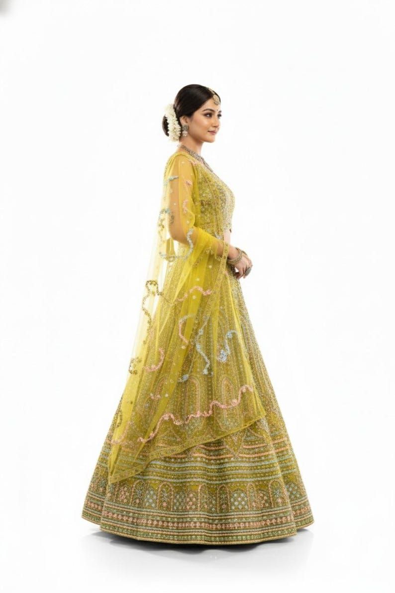 We offer a stunning Ladies Yellow Embroidered Lehenga Choli Set perfect for weddings. This set includes a Lehenga Choli with Dupatta made of high-quality Net with a soft Satin inner lining. The main color is vibrant Yellow with heavy Sequin & Zari embroidery work, adding a touch of elegance. The set comes with a full-length Lehenga that is semi-stitched for a comfortable fit. Care instructions recommend dry clean only. Ideal for manufacturers, exporters, and suppliers looking to provide exquisite ethnic wear for special occasions.