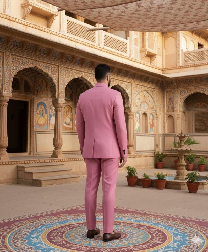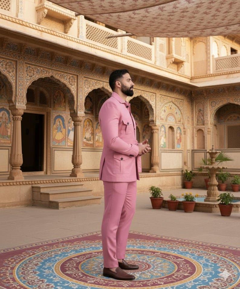 We offer a Mens Pink Indo Western 2 Piece Suit tailored to a slim fit, perfect for wedding functions. Crafted from premium suiting fabric in a striking pink color, this set includes an Indo-Western jacket featuring a contemporary design with a stand collar (Bandhgala style) and functional utility pockets. The front button closure adds a touch of sophistication. Ideal for manufacturers, exporters, and suppliers looking to provide high-quality formal wear for special occasions.
