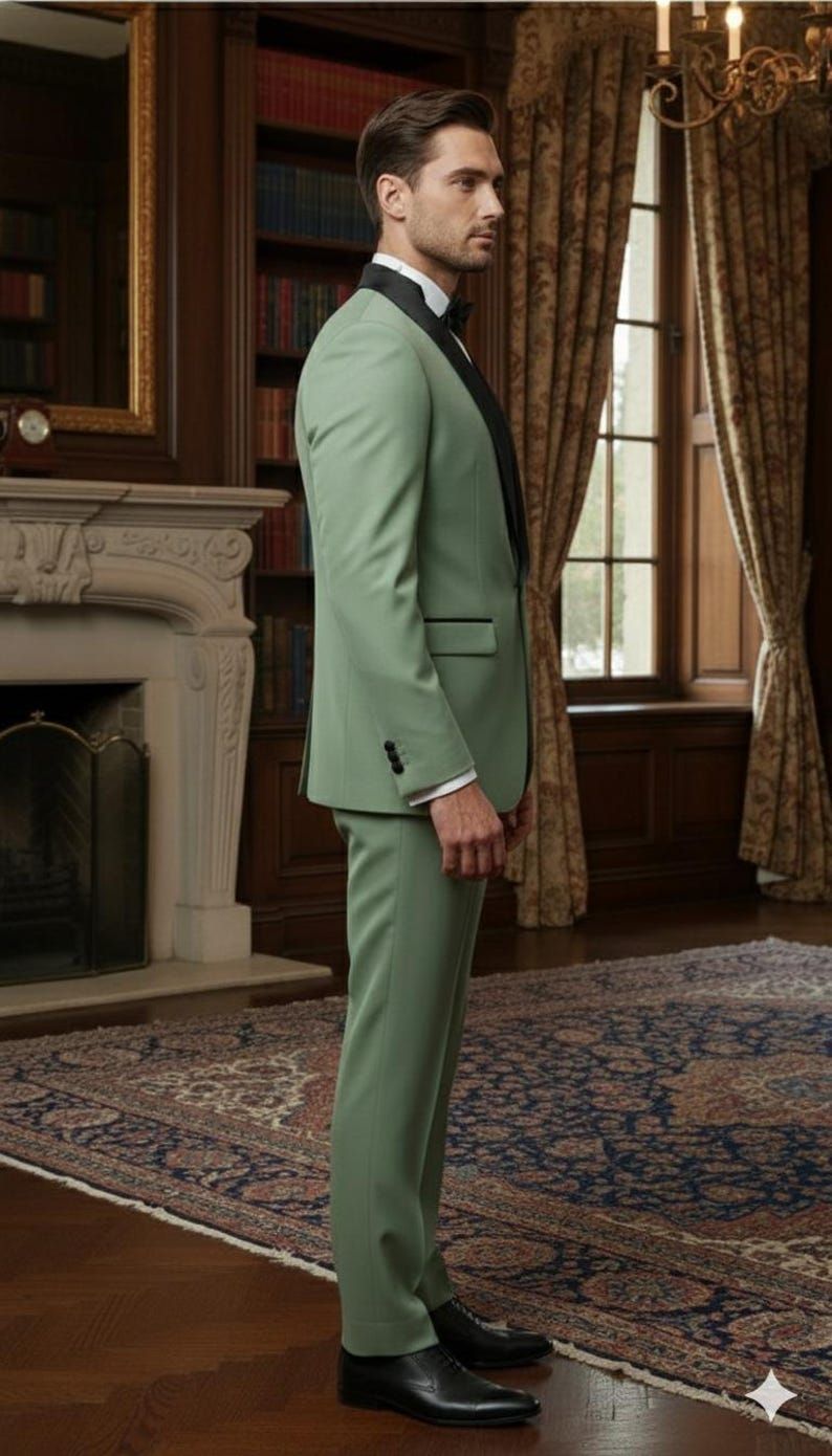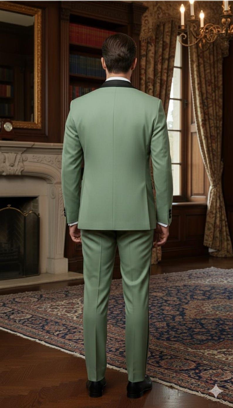 We offer a sophisticated Mens Sage Green & Black Satin Shawl Lapel Tuxedo Suit, perfect for wedding wear. This two-piece tuxedo suit features a slim fit design in premium suiting fabric. The sage green color with black satin contrast adds a touch of elegance. The single-breasted blazer with black satin shawl lapel and single front button exudes style. Ideal for manufacturers, exporters, and suppliers looking to provide high-quality formal wear. Includes tuxedo blazer and trouser, making it a must-have for any formal occasion.