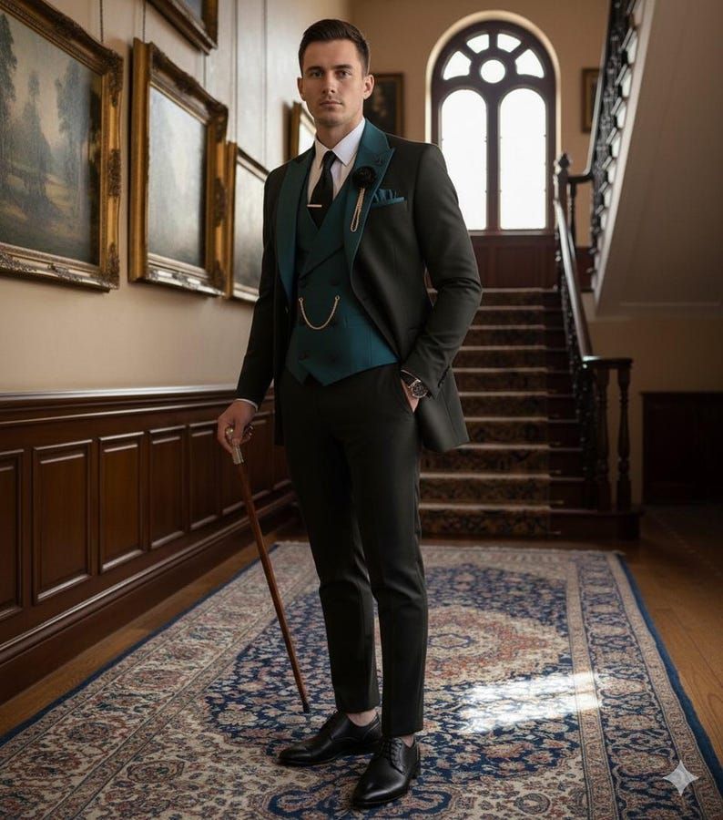 We offer a sophisticated Mens Green Slim Fit Tuxedo Suit crafted from premium suiting fabric in a striking Teal Green color. Perfect for wedding wear, this solid suit features satin contrast detailing, a slim fit design, and a classic Tuxedo Suit style. The set includes a single-breasted blazer with a sleek black satin shawl lapel and a double-breasted waistcoat. Ideal for manufacturers, exporters, and suppliers looking to provide high-quality formal wear for special occasions.