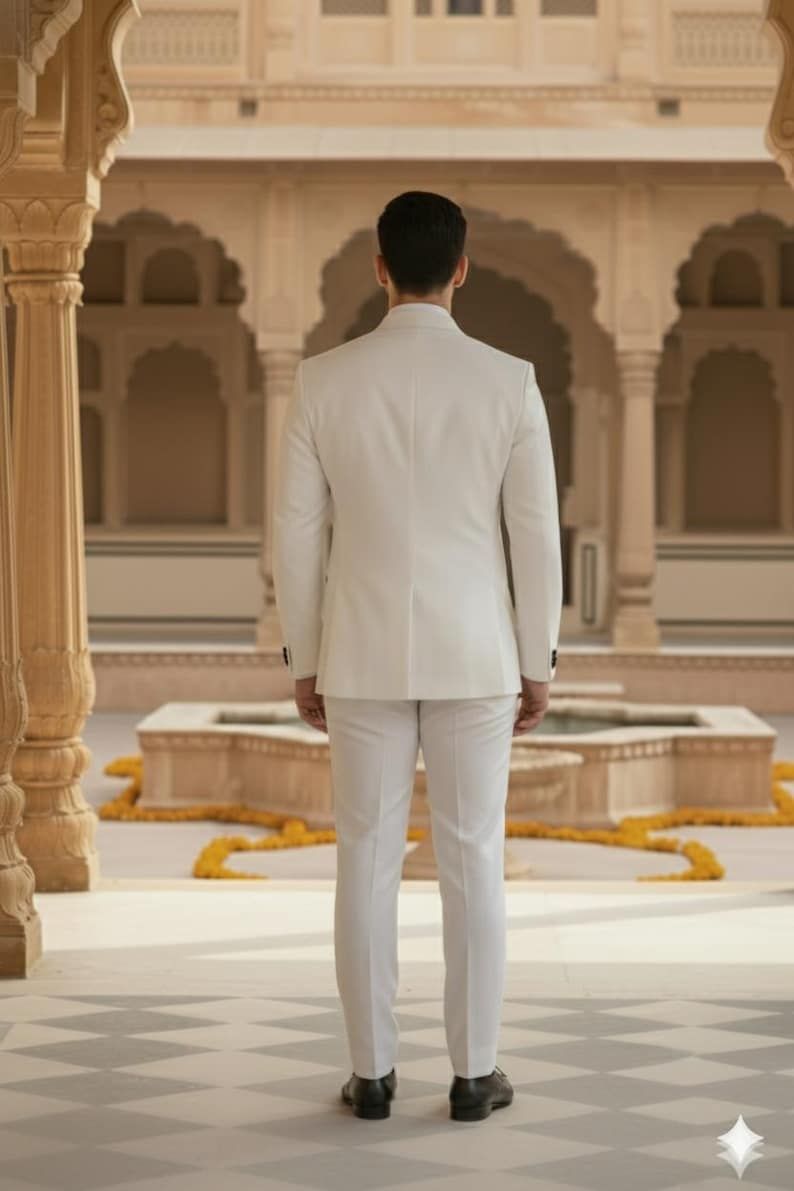 We offer a premium Mens White Classic Two Piece Tuxedo Suit crafted from high-quality suiting fabric in a sleek slim fit design. This 2 Piece Tuxedo Suit in elegant white is perfect for wedding wear, featuring a solid pattern with satin contrast detailing. The set includes a single-breasted blazer with a sophisticated black satin shawl lapel and satin covered buttons, paired with tailored trousers. Ideal for formal occasions, this suit exudes style and sophistication. As a leading Manufacturer, Exporter, and Supplier, we ensure top-notch quality and impeccable craftsmanship in every piece we deliver.