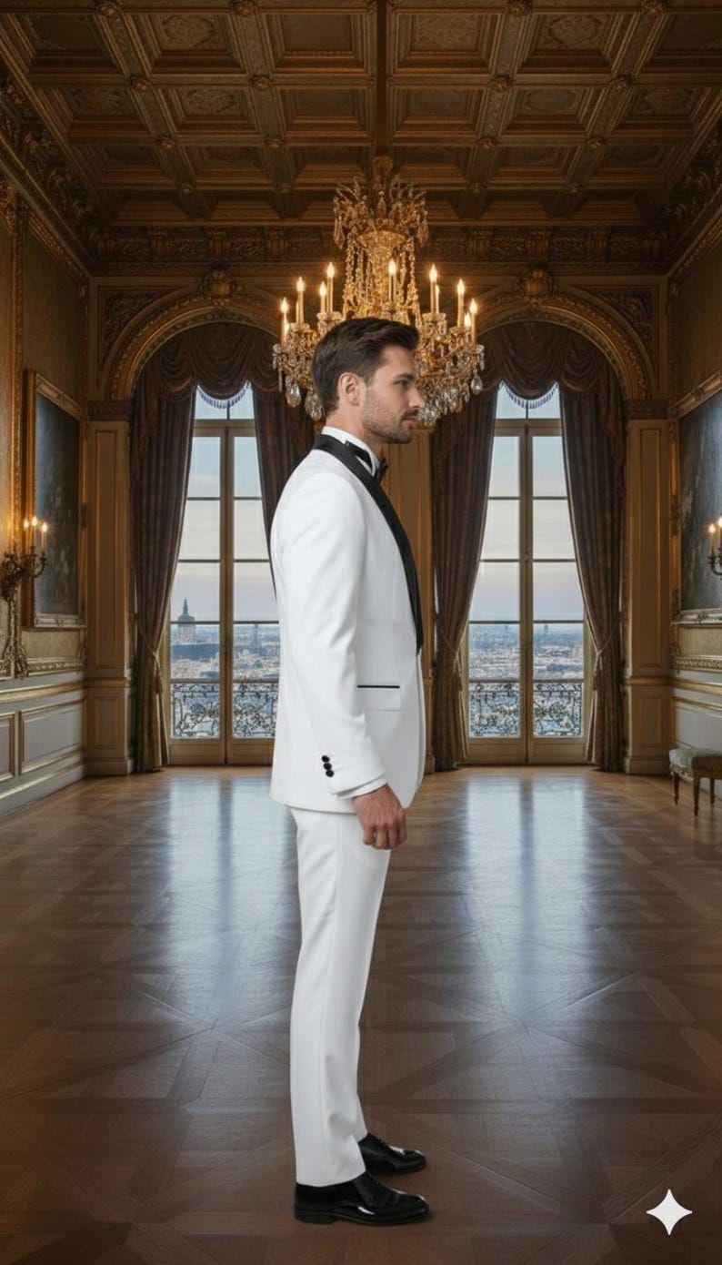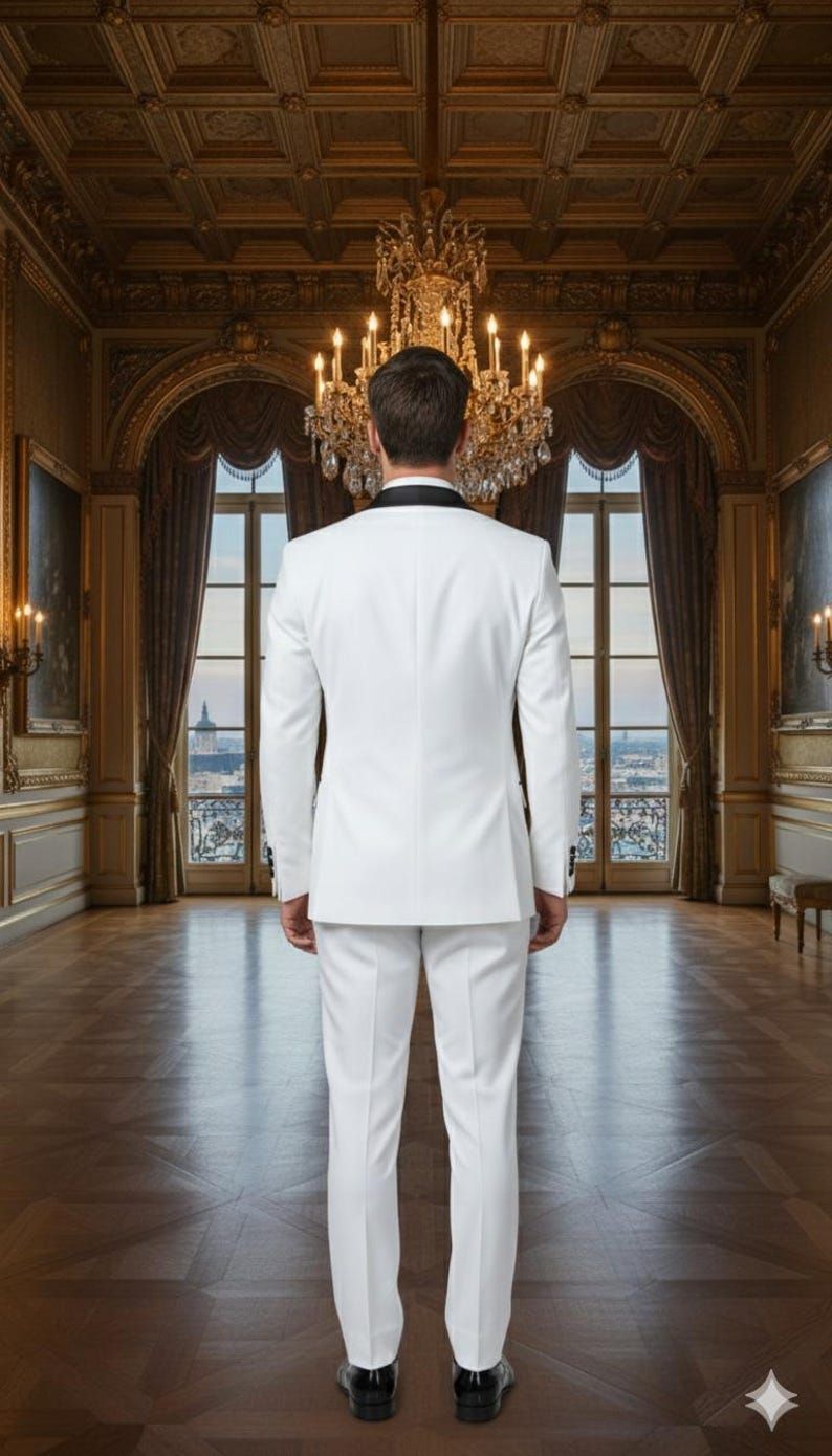 We offer a sophisticated Mens White Slim Fit Evening Tuxedo Suit crafted from premium suiting fabric, perfect for weddings. This 2-piece tuxedo suit features a single-breasted jacket with a stylish shawl lapel in contrasting black, adding a touch of elegance. The set includes a tuxedo jacket and trousers, tailored for a slim fit silhouette. Care instructions recommend dry clean only. Ideal for manufacturers, exporters, and suppliers looking to provide high-quality formal wear for special occasions.