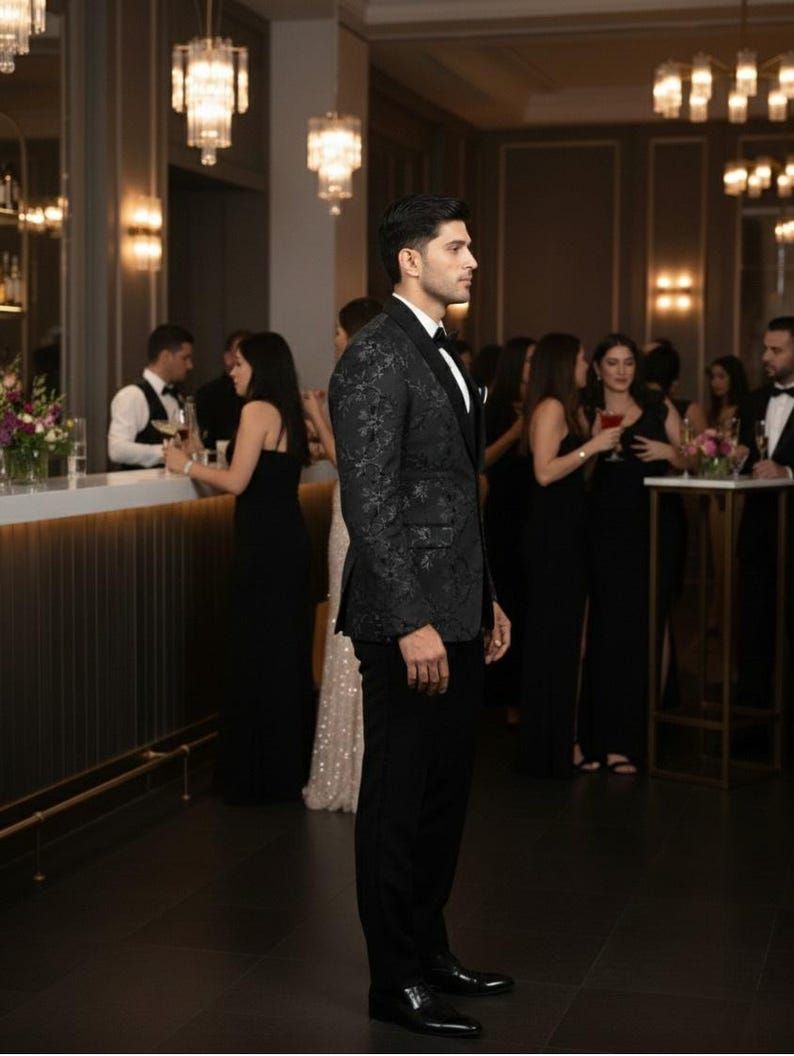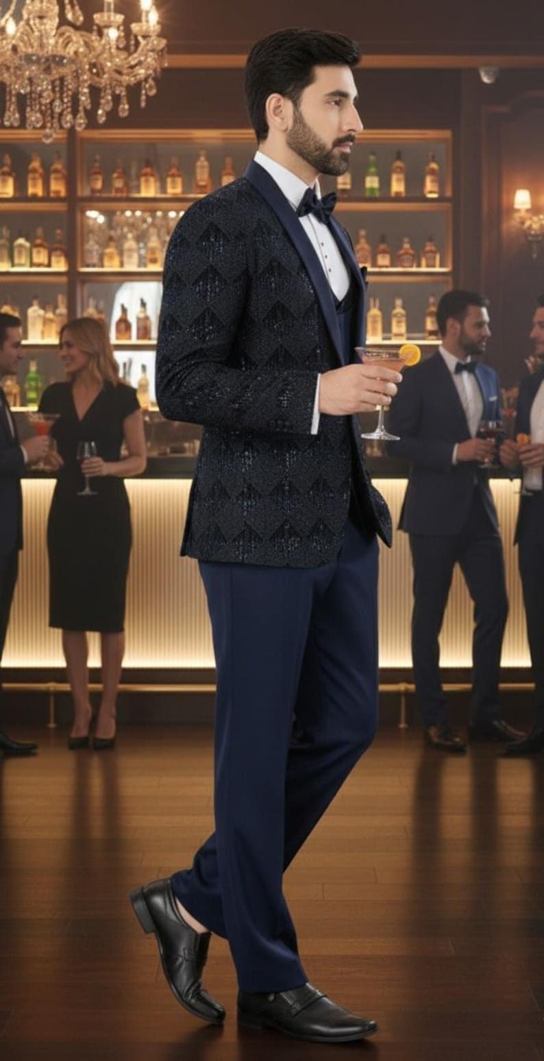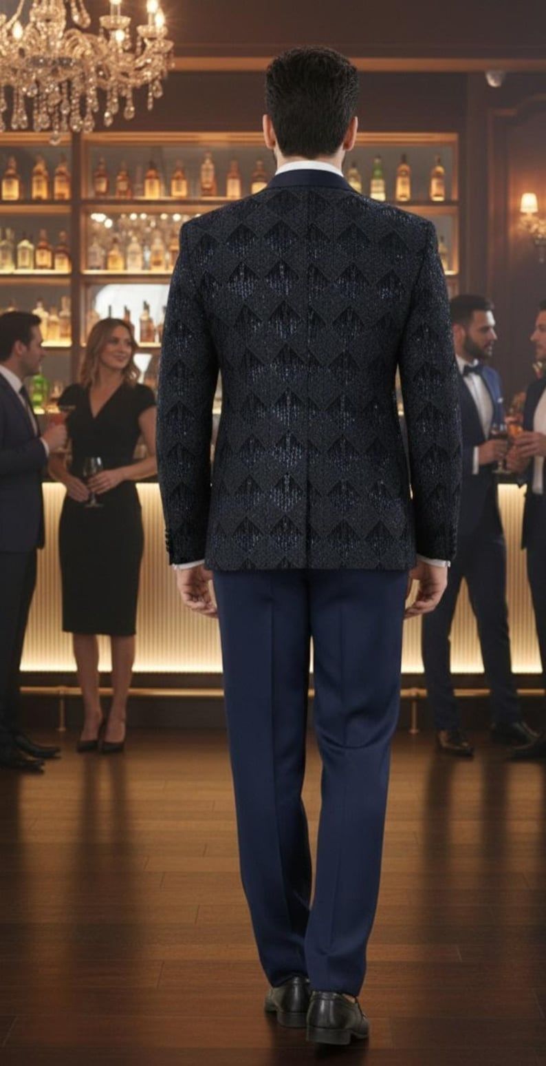 We provide a sophisticated Mens Black Sequin Slim Fit Tuxedo Suit crafted from premium sequin suiting fabric. This 2-piece tuxedo suit features an all-over sequin texture in classic black, perfect for parties. The slim fit design offers a modern silhouette, while the single-breasted jacket with a satin shawl lapel exudes elegance. Set includes tuxedo jacket and trousers. Care instructions: Dry clean only. Ideal for manufacturers, exporters, and suppliers looking to offer high-quality formal wear for special occasions.